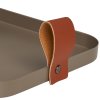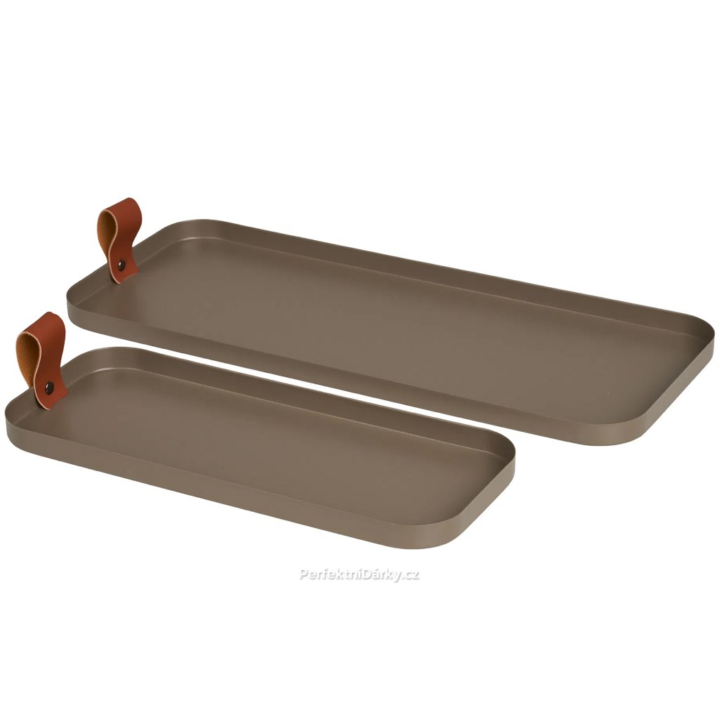 Stylová sada dvou dekorativních podnosů / odkladačů z oceli v hnědém matném provedení. Elegantní minimalistický design doplňuje kožené poutko, které dodává celku přírodní a skandinávský nádech. Vhodné pro aranžování svíček, drobných dekorací nebo jako praktický doplněk na komodu či konferenční stolek.