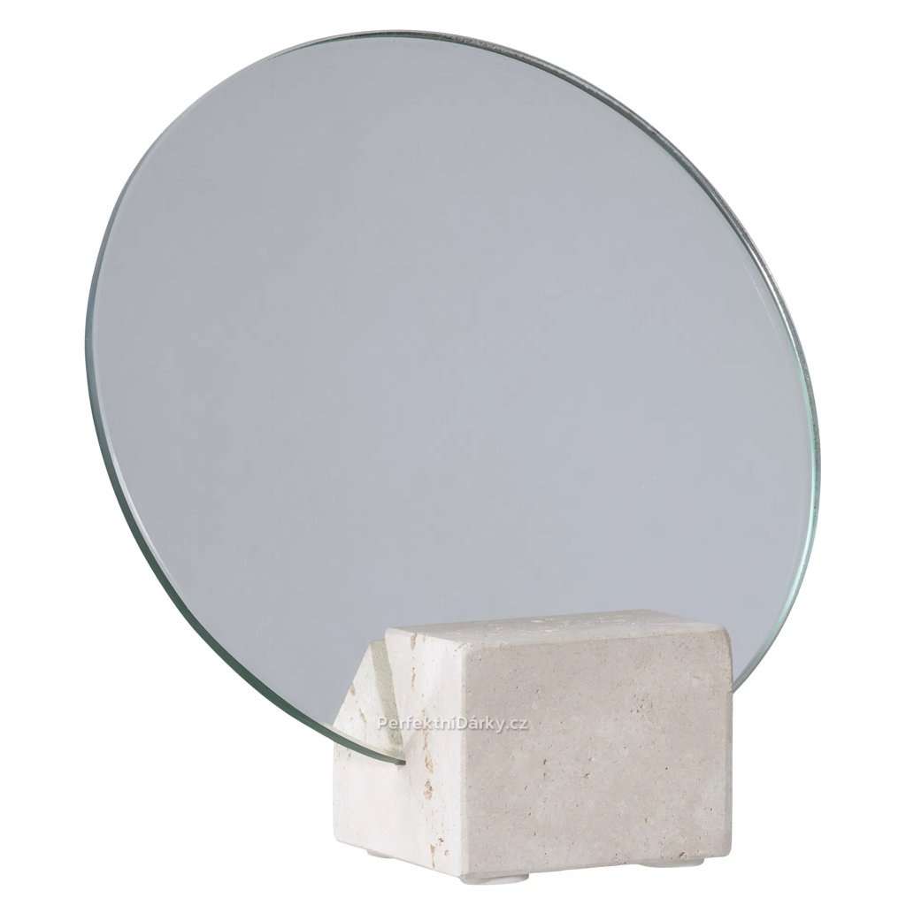 Elegantní stolní zrcadlo s podstavcem z přírodního travertinu v minimalistickém skandinávském stylu. Kombinace kamene a čistého skla vytváří harmonický a moderní doplněk, který skvěle zapadne do koupelny, ložnice i předsíně. Každý kus je originál díky přirozené struktuře kamene.