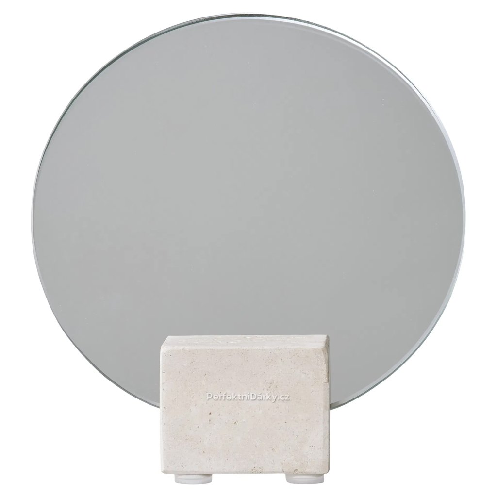 Elegantní stolní zrcadlo s podstavcem z přírodního travertinu v minimalistickém skandinávském stylu. Kombinace kamene a čistého skla vytváří harmonický a moderní doplněk, který skvěle zapadne do koupelny, ložnice i předsíně. Každý kus je originál díky přirozené struktuře kamene.