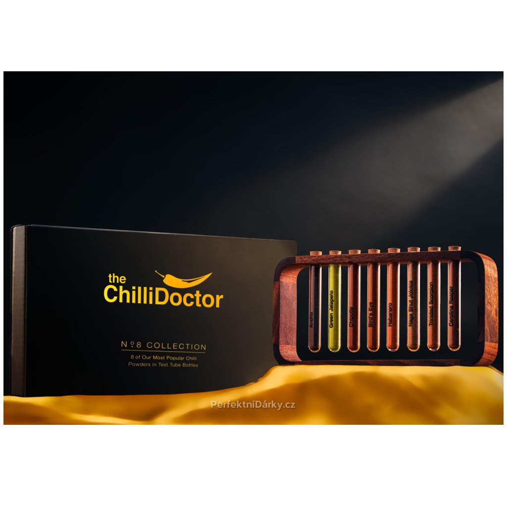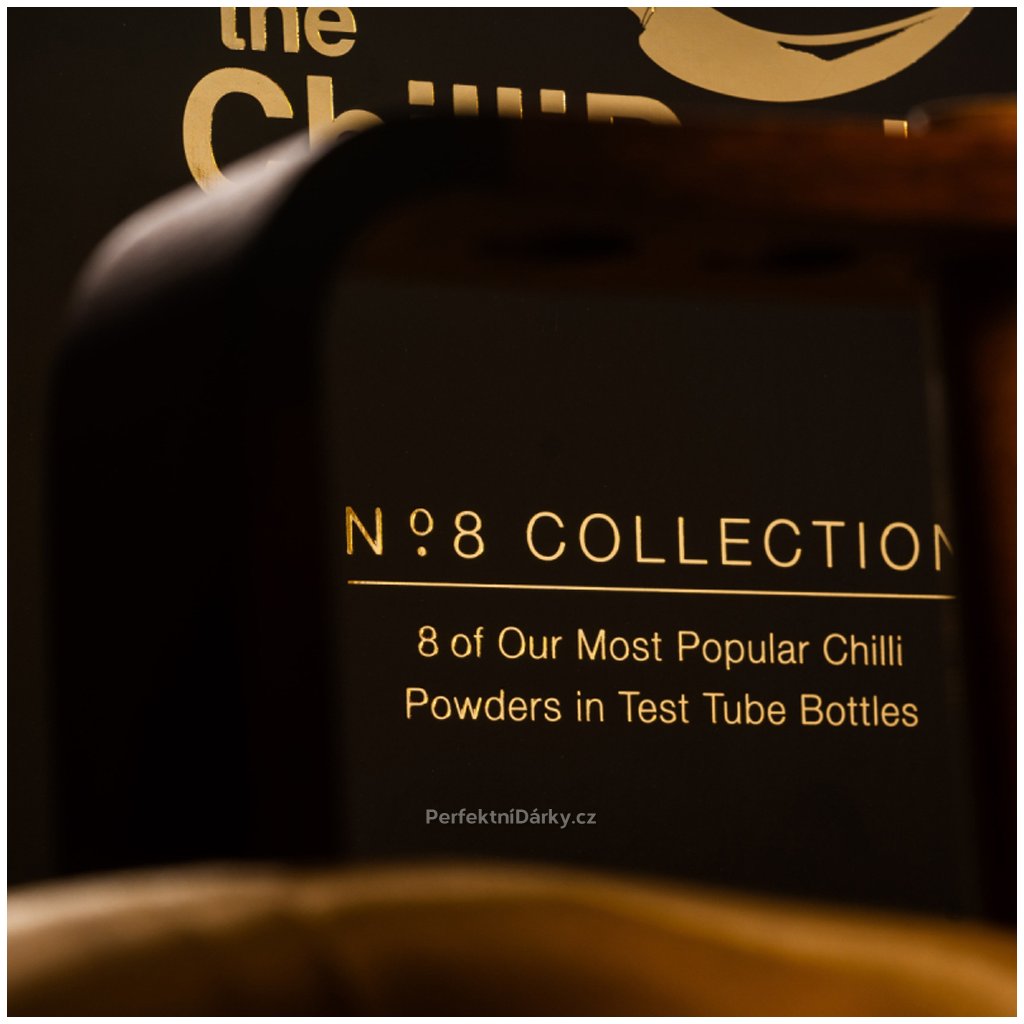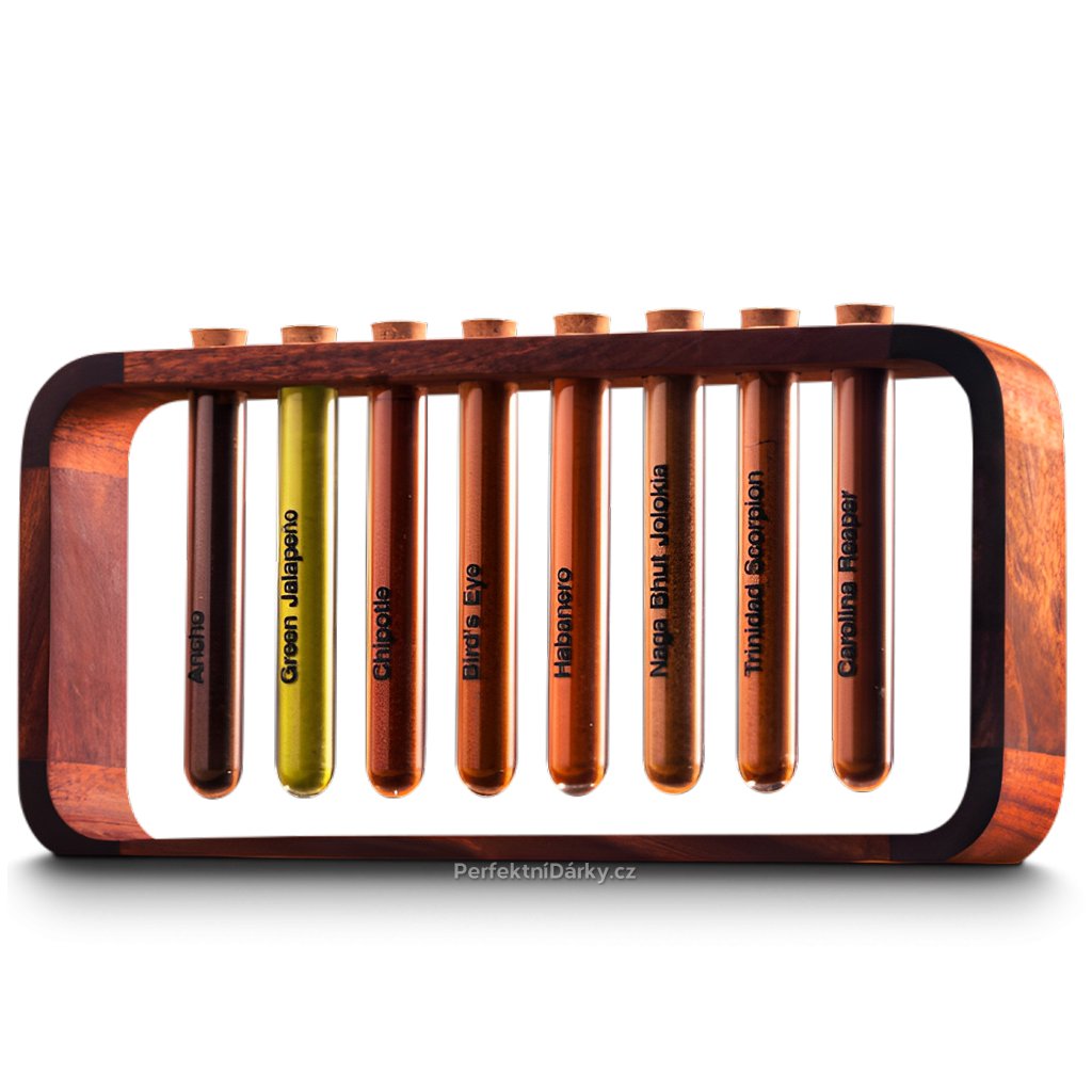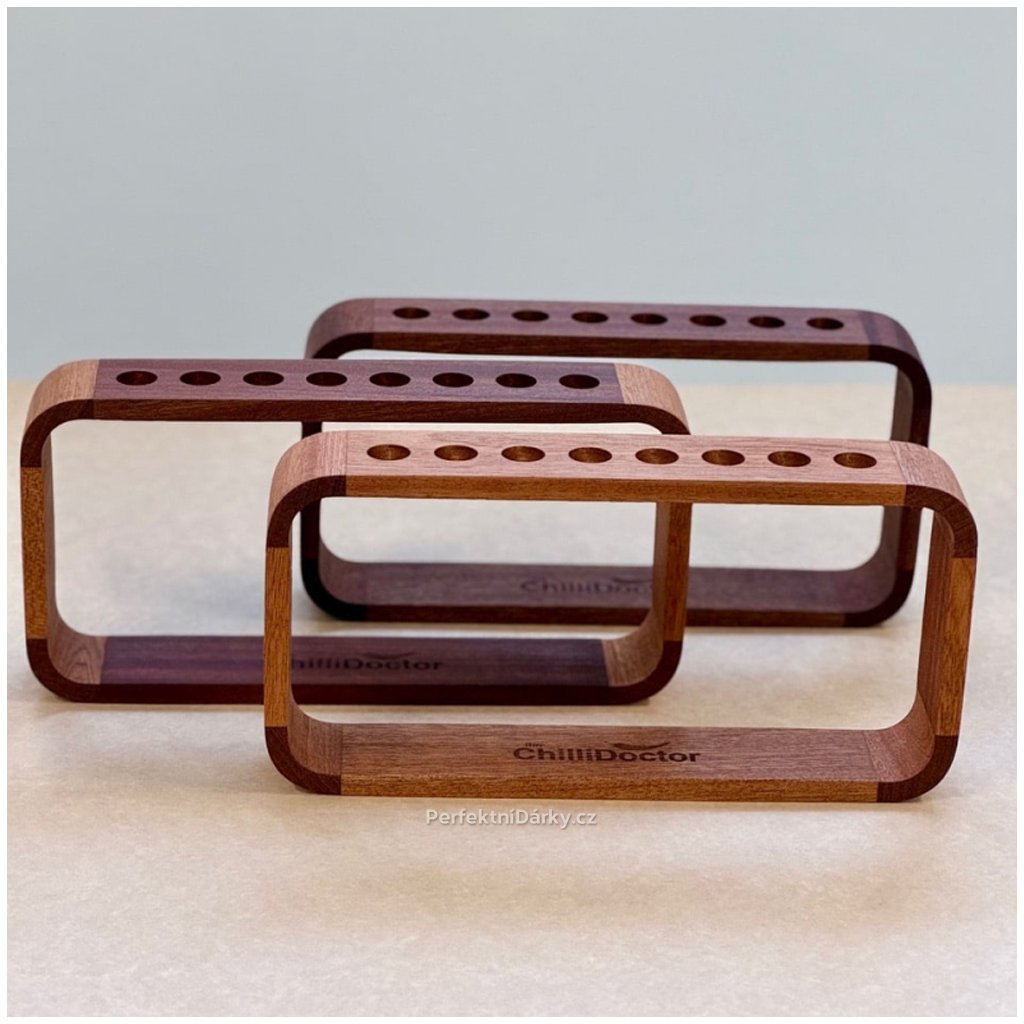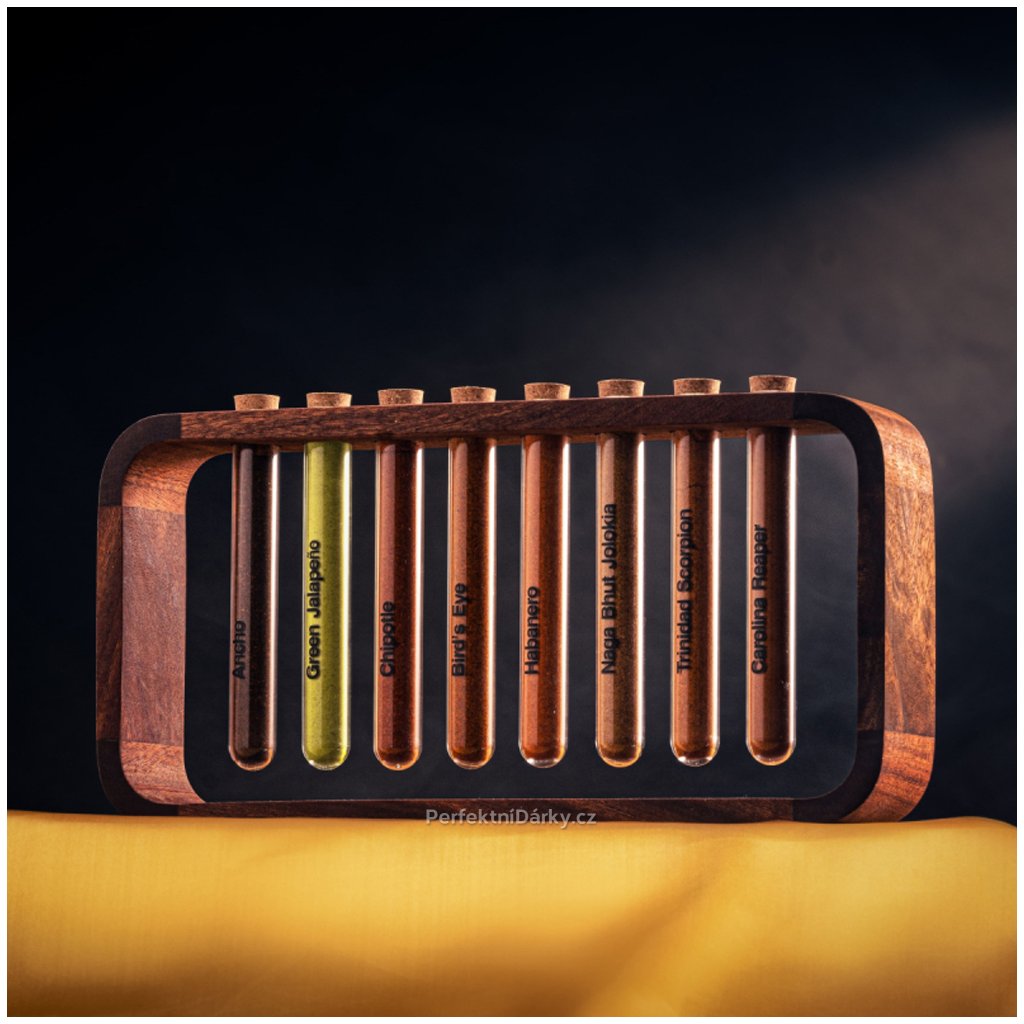Jen ty nejlepší chilli papričky si zaslouží speciální skladování. Elegantní stojan na koření v limitované edici, ručně vyrobený z kvalitního mahagonového dřeva. Obsahuje 8 nejoblíbenějších chilli prášků zabalených do opakovaně plnitelných, skleněných zkumavek uzavřených korkem.