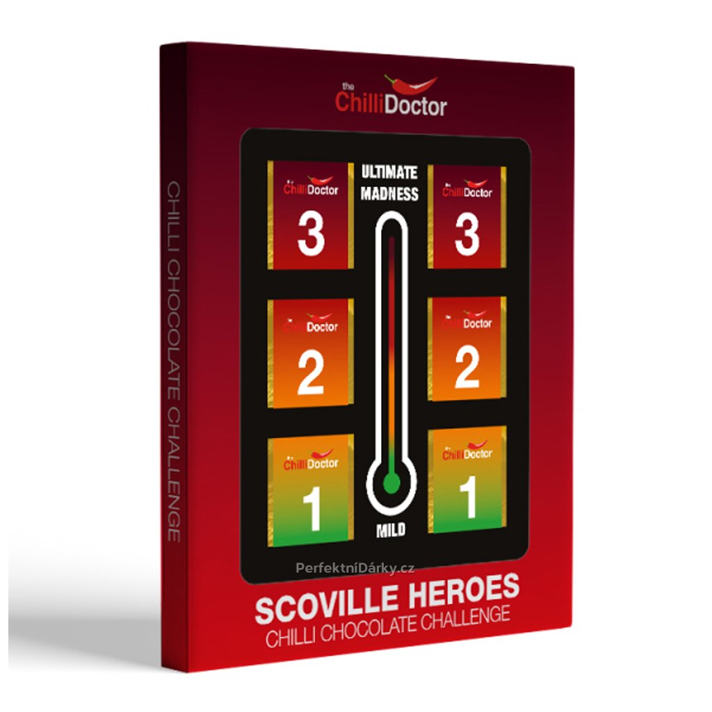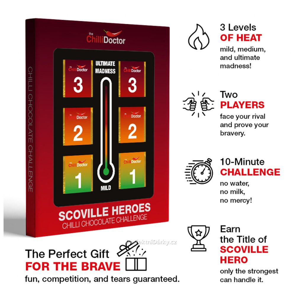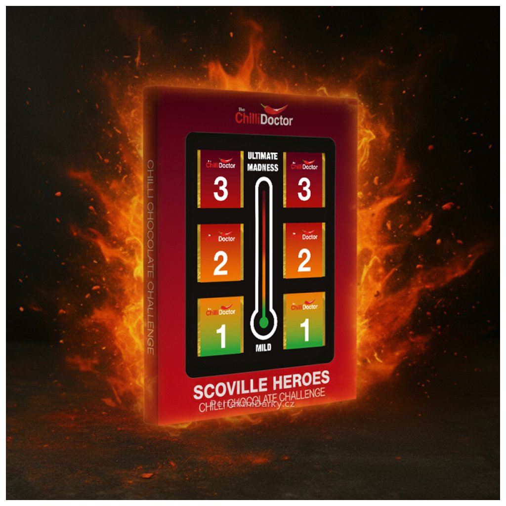 Vstup do arény se Scoville Heroes, ultimátní chilli čokoládovou výzvou pro odvážné. Tento jedinečný dárkový set je určen pro dva hráče, kteří se nebojí čelit pálivosti naplno - ve třech kolech: od mírné, přes střední až po totální šílenství.