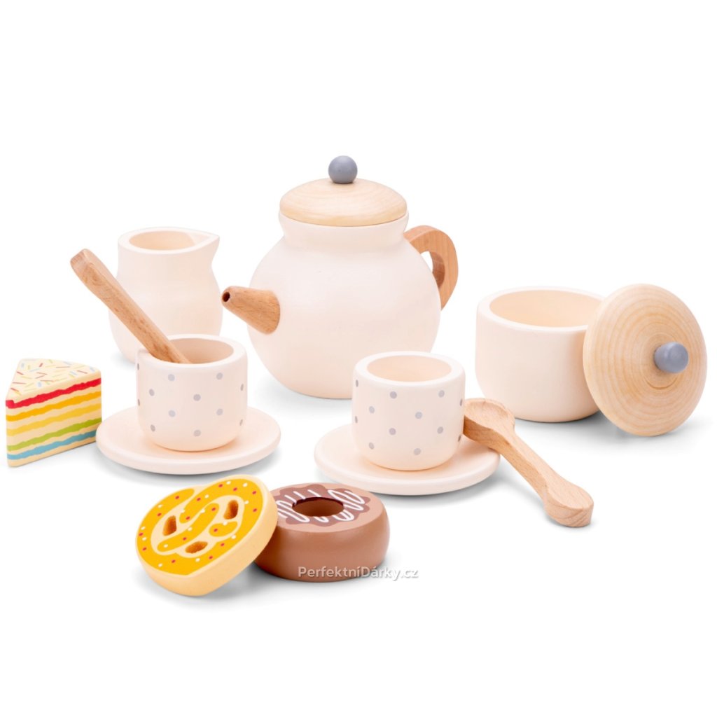 Součástí je vše, co malý hostitel nebo hostitelka potřebují - konvička s odnímatelným víčkem, hrnečky, podšálky, lžičky, dóza na cukr, džbánek na mléko a tři různé dřevěné zákusky. Vše je vyrobeno z kvalitního certifikovaného dřeva FSC®.