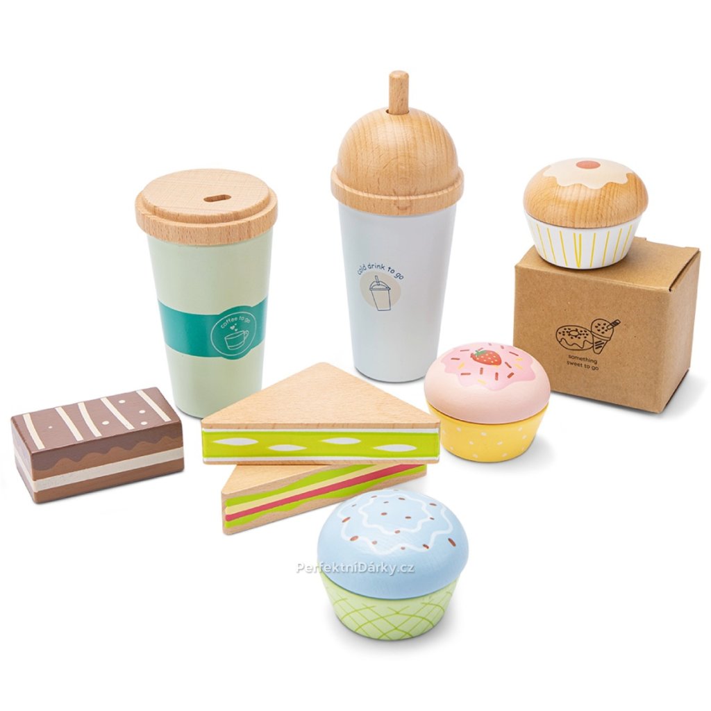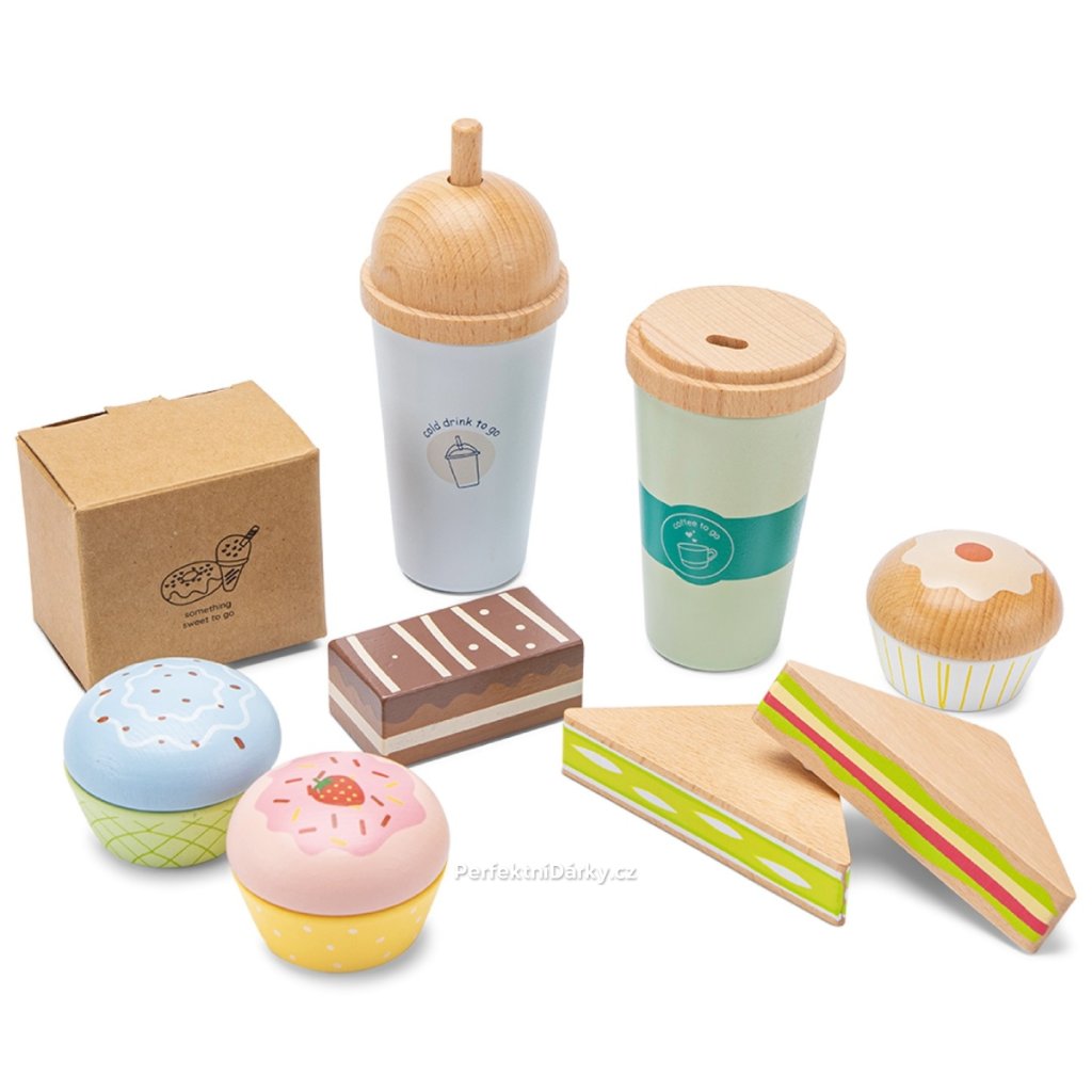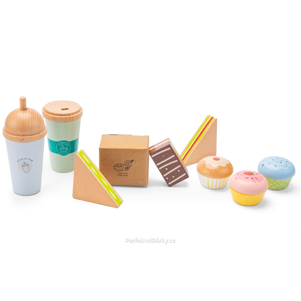 Sada obsahuje dva nápoje s víčky, dva sendviče, brownie, tři spodní části cupcakes, tři různé vršky na cupcakes se suchým zipem a krabičku na odnos. Vše je vyrobeno z kvalitního certifikovaného dřeva FSC®.