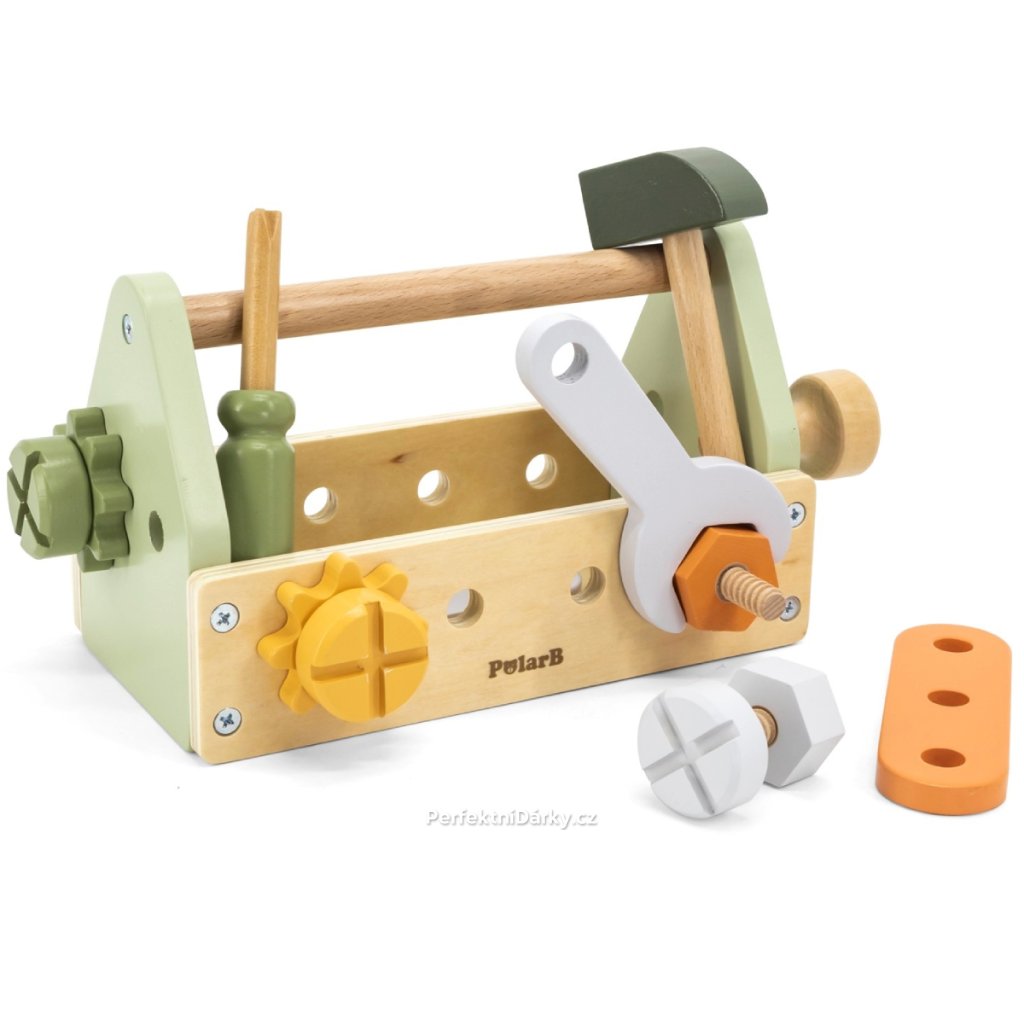 Dřevěná sada nářadí PolarB je ideální hračka pro všechny malé opraváře a stavitele. Pevná dřevěná bedýnka obsahuje vše, co děti potřebují ke šroubování, zatloukání a kreativnímu tvoření. V sadě najdou kladivo, klíč, šroubovák, šrouby, matice, ozubená kola a spojovací díly - díky nim mohou stavět a zkoušet jednoduché mechanické principy.