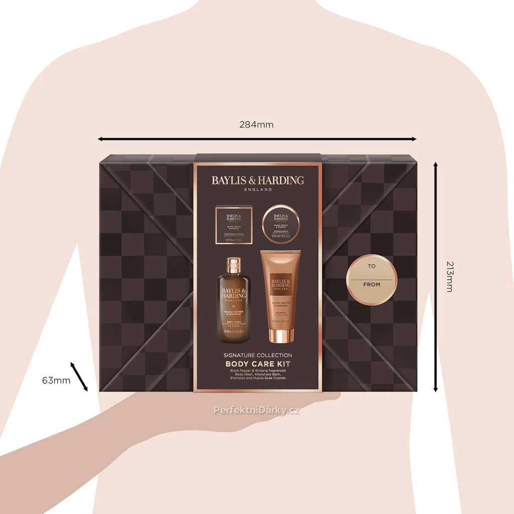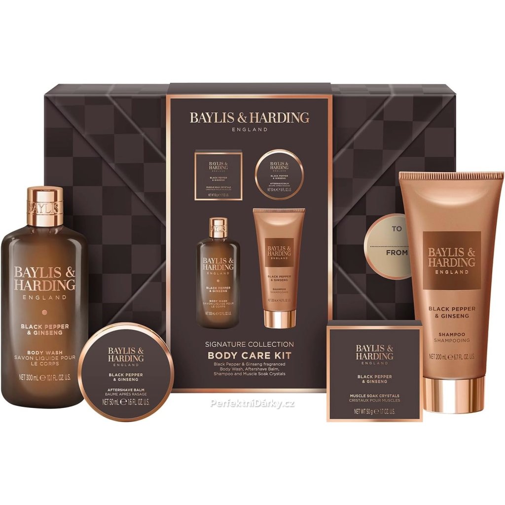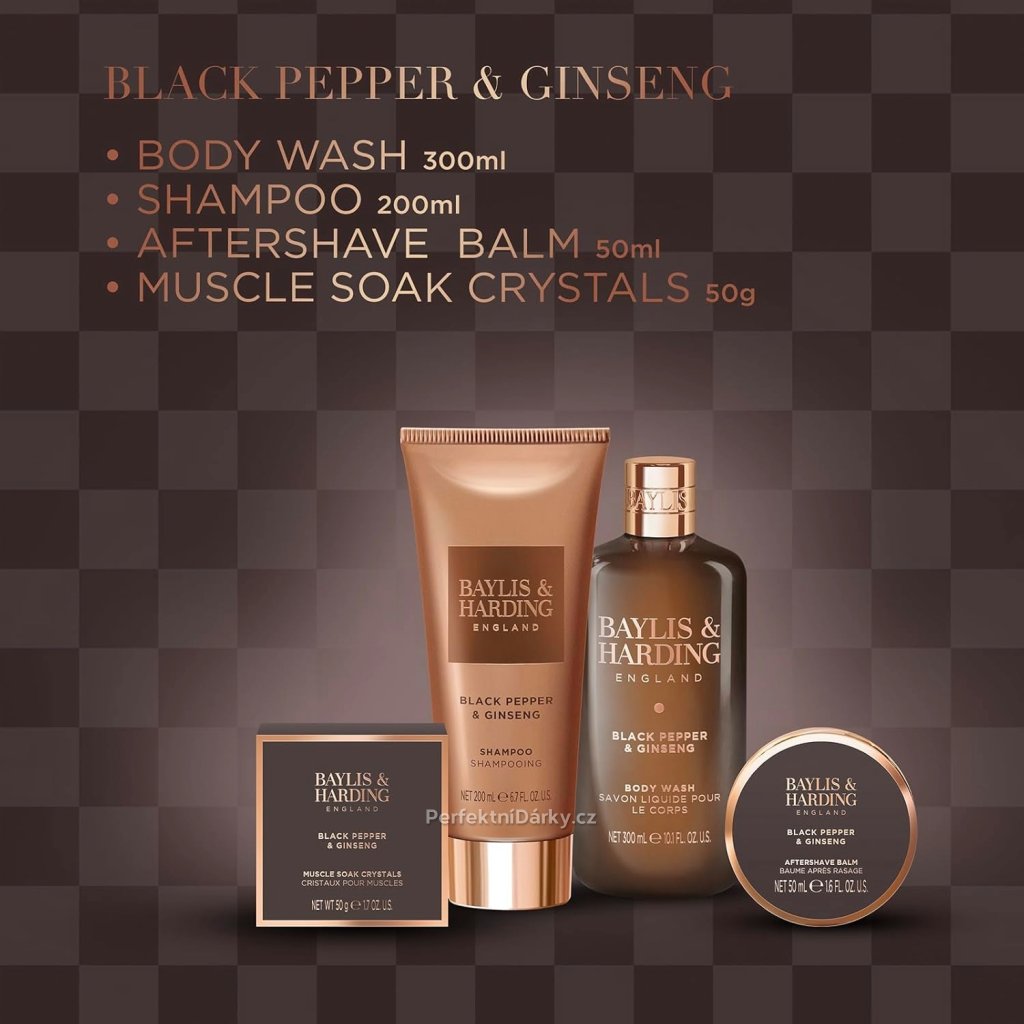 Dopřejte si nebo svým blízkým chvíle skutečného uvolnění s pánskou sadou Black Pepper & Ginseng. Tato exkluzivní kolekce kombinuje sprchový gel, šampon a balzám po holení, které společně poskytují dokonalou péči o pokožku i vlasy. Osvěžující vůně černého pepře a ženšenu s tóny cedrového a santalového dřeva přináší pocit energie, síly a sebevědomí – ideální pro moderního gentlemana.