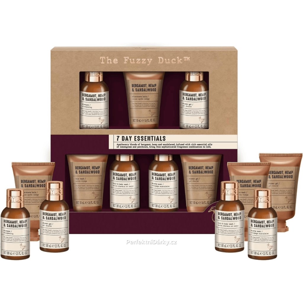 V prémiové kolekci The Fuzzy Duck se snoubí divoká přírodní estetika s gentlemanskou elegancí. Rustikální tóny inspirované přírodou se mísí s vínovou barvou a bronzovými detaily, které doplňuje lékárnický styl etiket. Jedinečná vůně celé řady propojuje sametové santalové dřevo, hřejivé konopí a svěží bergamot, čímž vytváří harmonickou a mužnou kompozici.