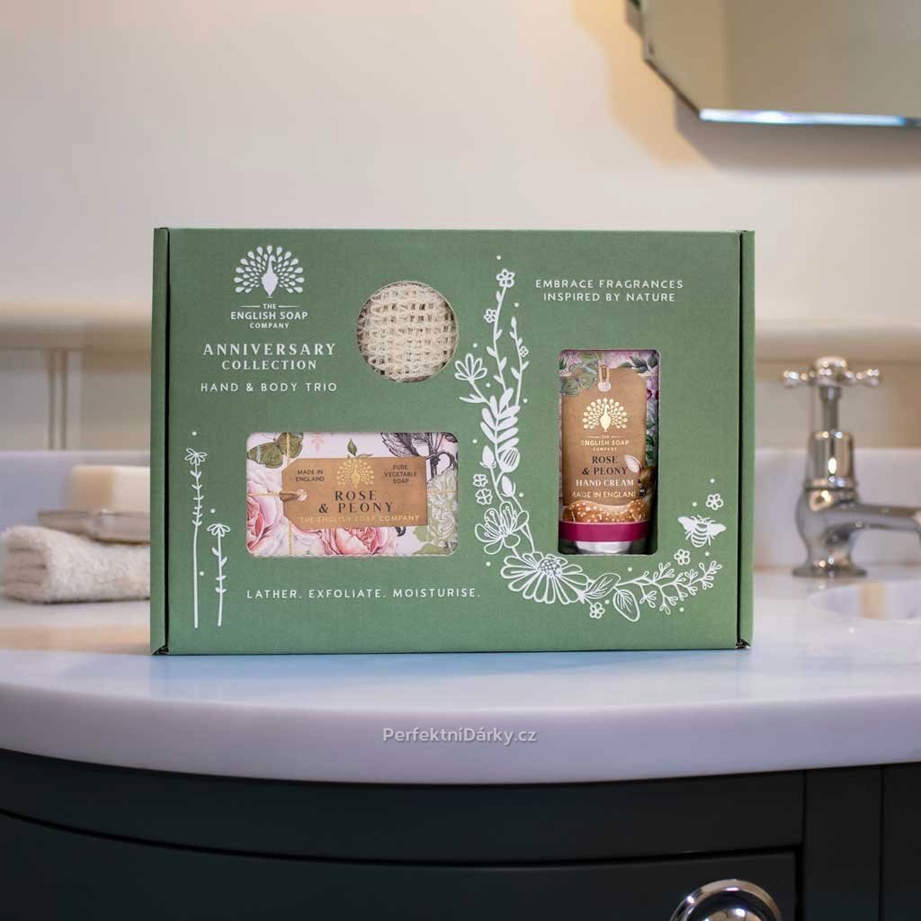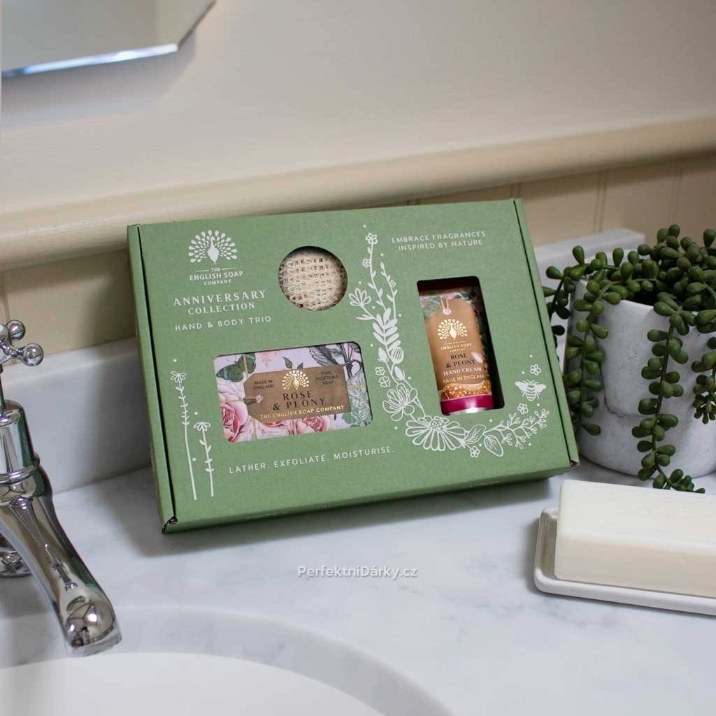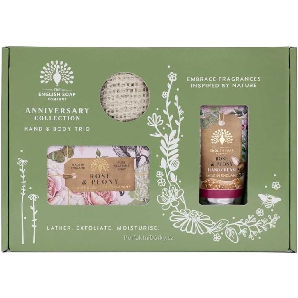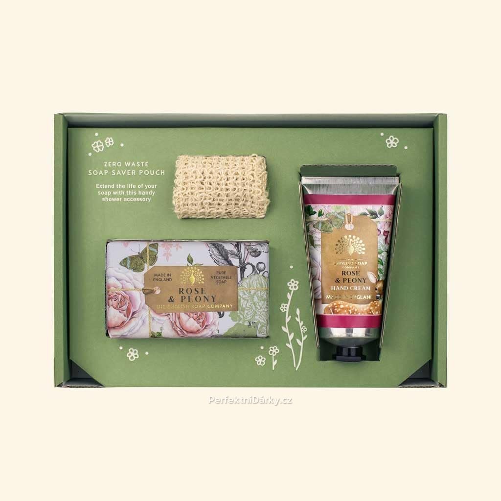 Dárková sada s vůní pivoňky a růže (English Soap Company) přináší kouzelný rituál péče o pokožku inspirovaný přírodou a svěžími květinami. V sadě najdete krém na ruce, tuhé mýdlo a tkaný pytlíček na mýdlo, který prodlužuje jeho životnost a zajistí jemný peelingový efekt.