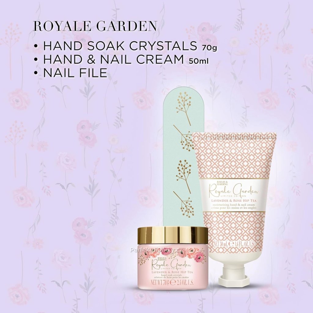 Dopřejte svým rukám dokonalou péči s manikúrní sadou Baylis & Harding Royale Garden. Tato elegantní sada kombinuje relaxační sůl do lázně, která pokožku zjemní a uvolní, s výživným krémem na ruce a nehty, jenž hloubkově hydratuje a pečuje o nehtovou kůžičku. Vůně levandule a šípkového čaje navodí pocit klidu a pohody, zatímco praktický pilník zajistí perfektní tvar vašich nehtů.
