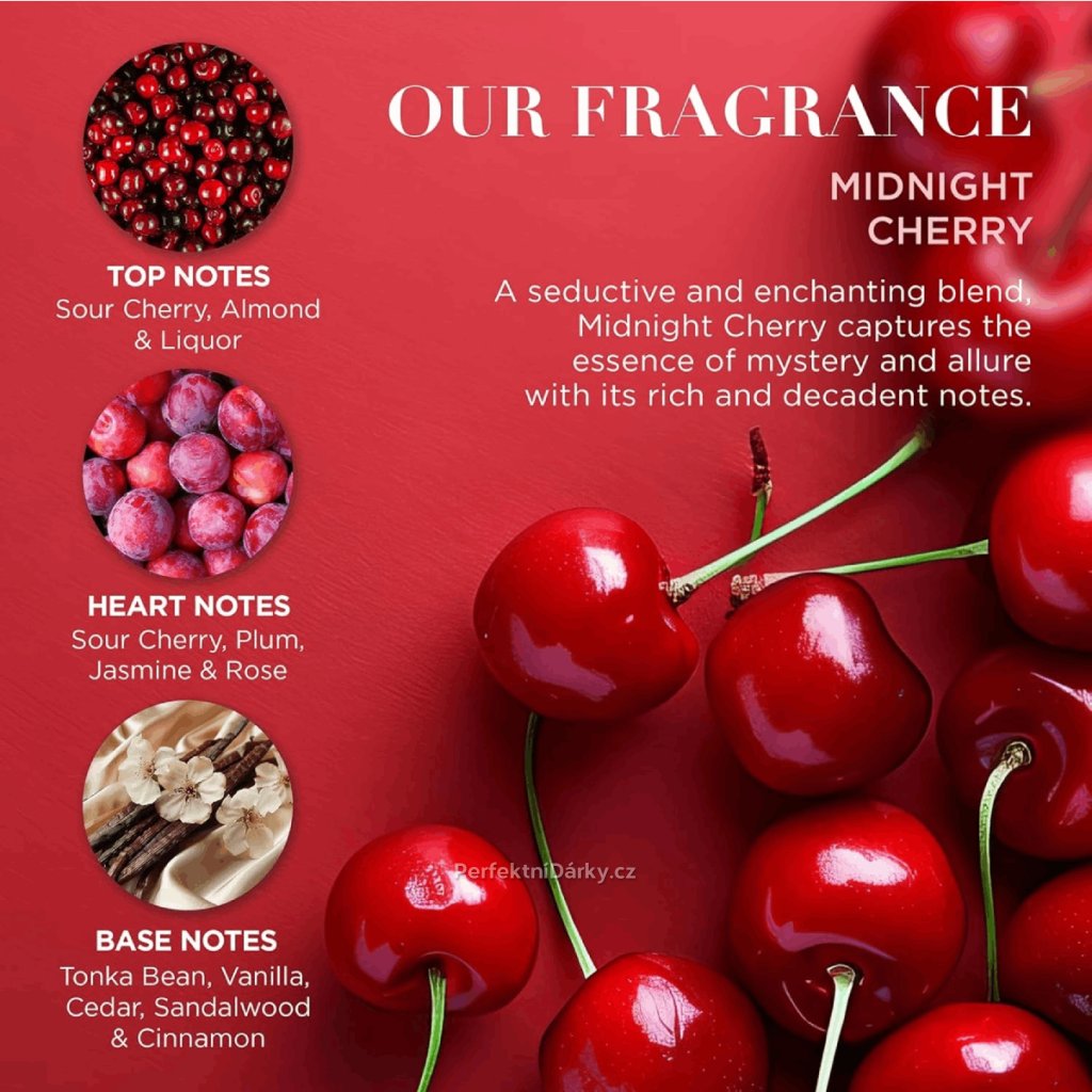 Kolekce Midnight Cherry přináší vůni sladkokyselých třešní, jemných mandlí a likéru, které společně vytvářejí hřejivý zážitek připomínající kouzlo zimních večerů. Výrazné rudé a růžové tóny doplněné zlatými detaily dodávají celé kolekci slavnostní vzhled a dělají z této sady elegantní a smyslný dárek.
