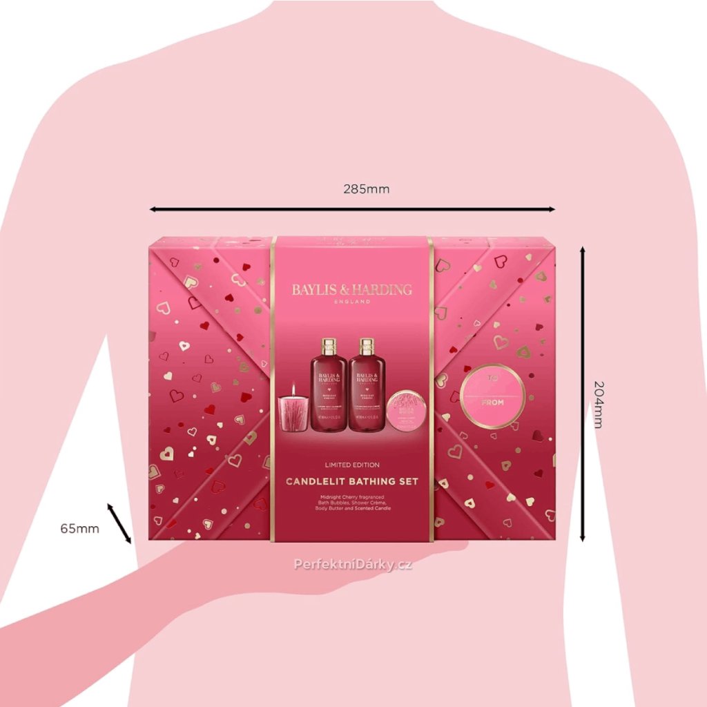 Dopřejte si chvíle rozmazlování s touto luxusní sadou, která promění obyčejný mycí rituál v nádherný zážitek. Svěží a ovocná vůně třešní, mandlí a kapky likéru probudí vaše smysly a navodí atmosféru sladké pohody. Zapalte vonnou svíčku, vykouzlete si v koupelně intimní světlo a ponořte se do bohaté pěny sprchového krému nebo si užijte hřejivou koupel. Pokožku následně potěšte vyživujícím tělovým máslem, které ji zanechá hebkou, hladkou a provoněnou. Tato sada je ideálním dárkem pro každou ženu, která si zaslouží chvíli klidu a péče – třeba i pod vánočním stromečkem.