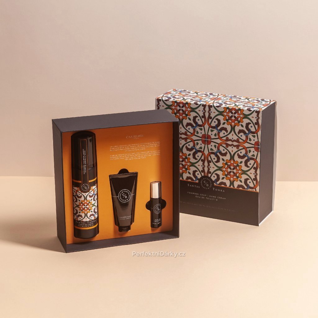 Sada obsahuje pěnivé mýdlo, které jemně čistí pokožku, krém na ruce, jenž ji zanechá hebkou a hydratovanou, a mini toaletní vodu, ideální na cesty nebo do kabelky. Celá kolekce vyzařuje teplo, klid a eleganci, zatímco vůně santalového dřeva a tonky vytváří hřejivou, podmanivou atmosféru.