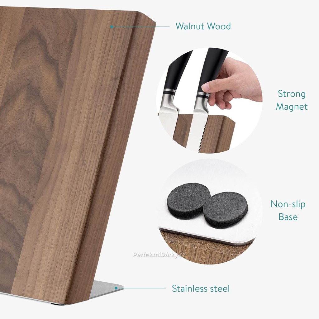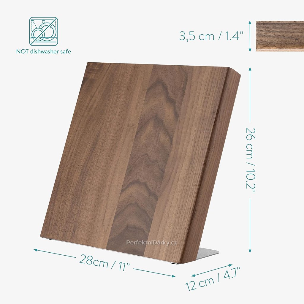 Stojan na nože z vysoce kvalitního ořechového dřeva se stane ozdobou vaší kuchyně. Silný magnet zajistí, aby nože zůstaly na svém místě.
