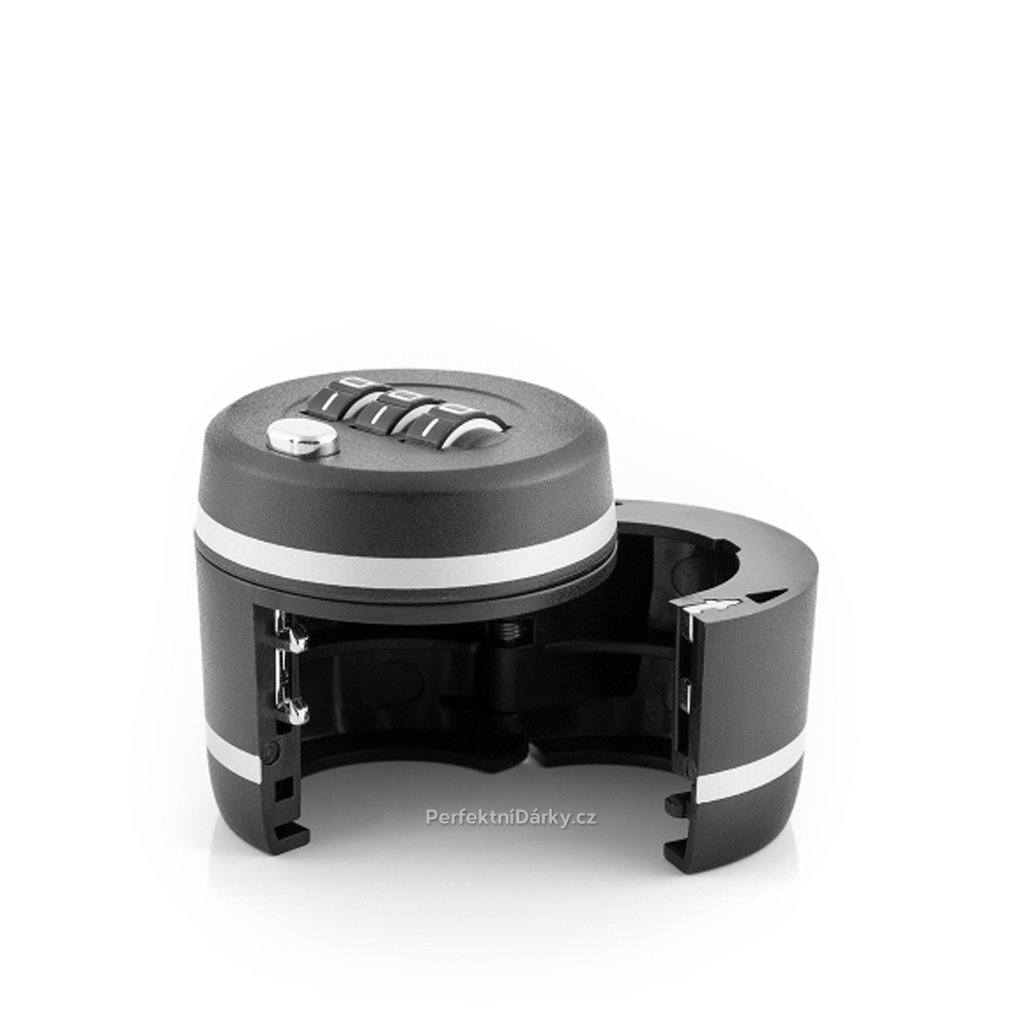 Zámek na kód na láhve vína s moderním a elegantním designem zabezpečí vaší oblíbenou láhev vína či jiného alkoholu. Lze jej použít u lahví o maximálním průměru hrdla 28 mm, kterých je naprostá většina. Baleno v úhledné produktové krabičce.