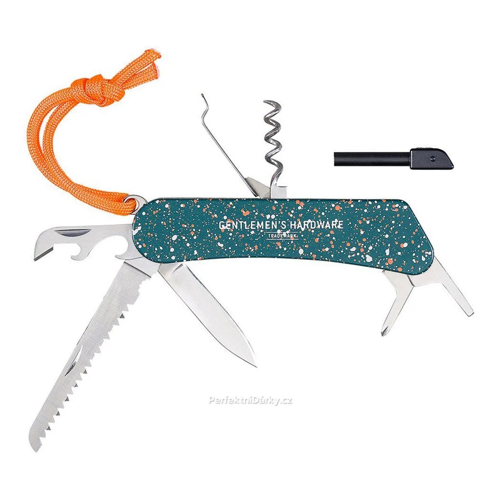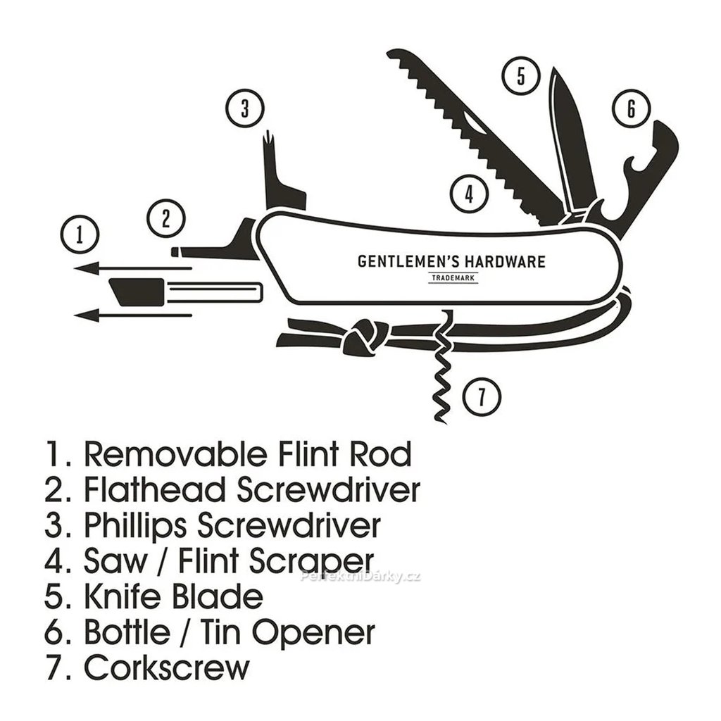 - Funkce: křesadlo (odnímatelné), 2× šroubovák, pilka, škrabka na křesadlo, čepel, otvírák na láhve, otvírák na konzervy, vývrtka