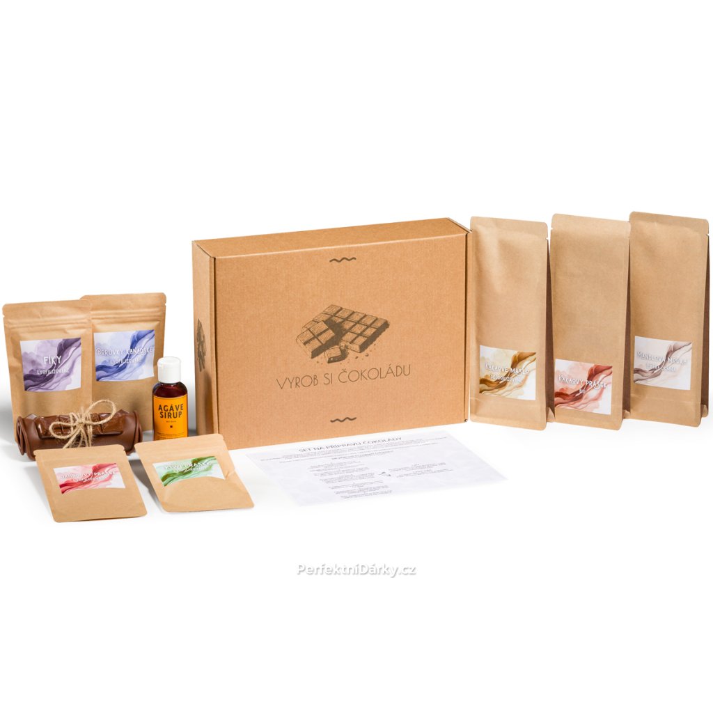Uvnitř najdete vše potřebné k výrobě čokolády – od kakaového másla až po čtyři druhy posypů pro finální doladění vzhledu i chuti. Celý set je krásně zabalený v designové dárkové krabičce s potiskem, takže je připravený rovnou k předání.